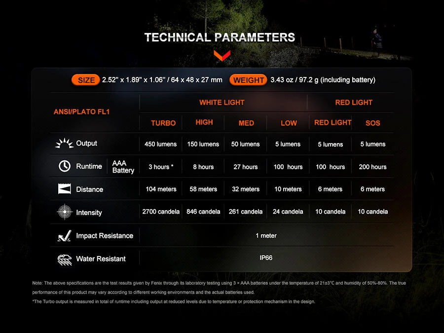 Turbo: 450 lumens (3 hrs total inc temperature and battery level step downs) – 104m beam
