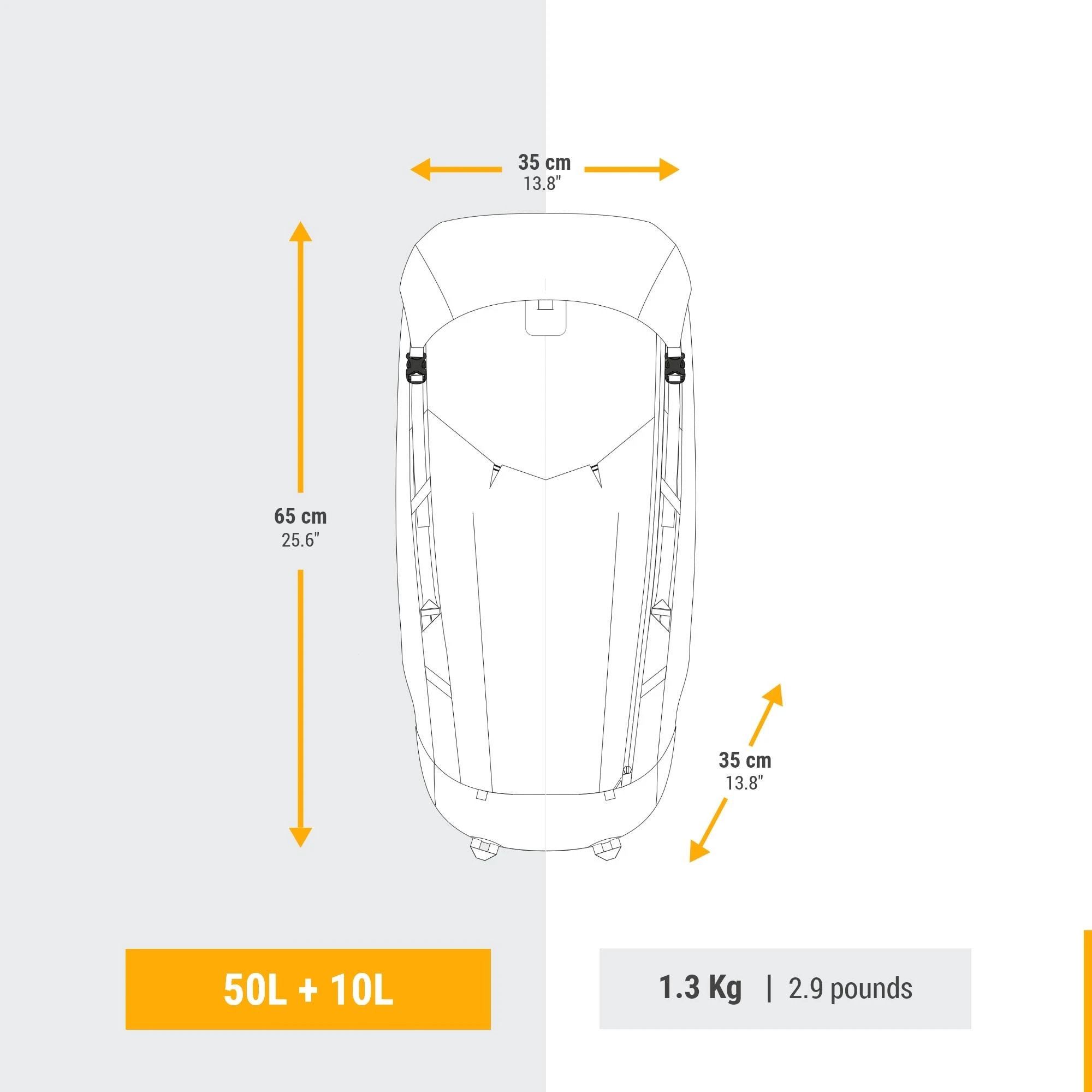50 L volume +10 L extension. The volume of each backpack is measured using a standardised method. we use small balls to fill the main compartment as well as each pocket. The balls are then emptied into a graduated container in order to determine the equivalent volume in litres, with a margin of error of just a few %.