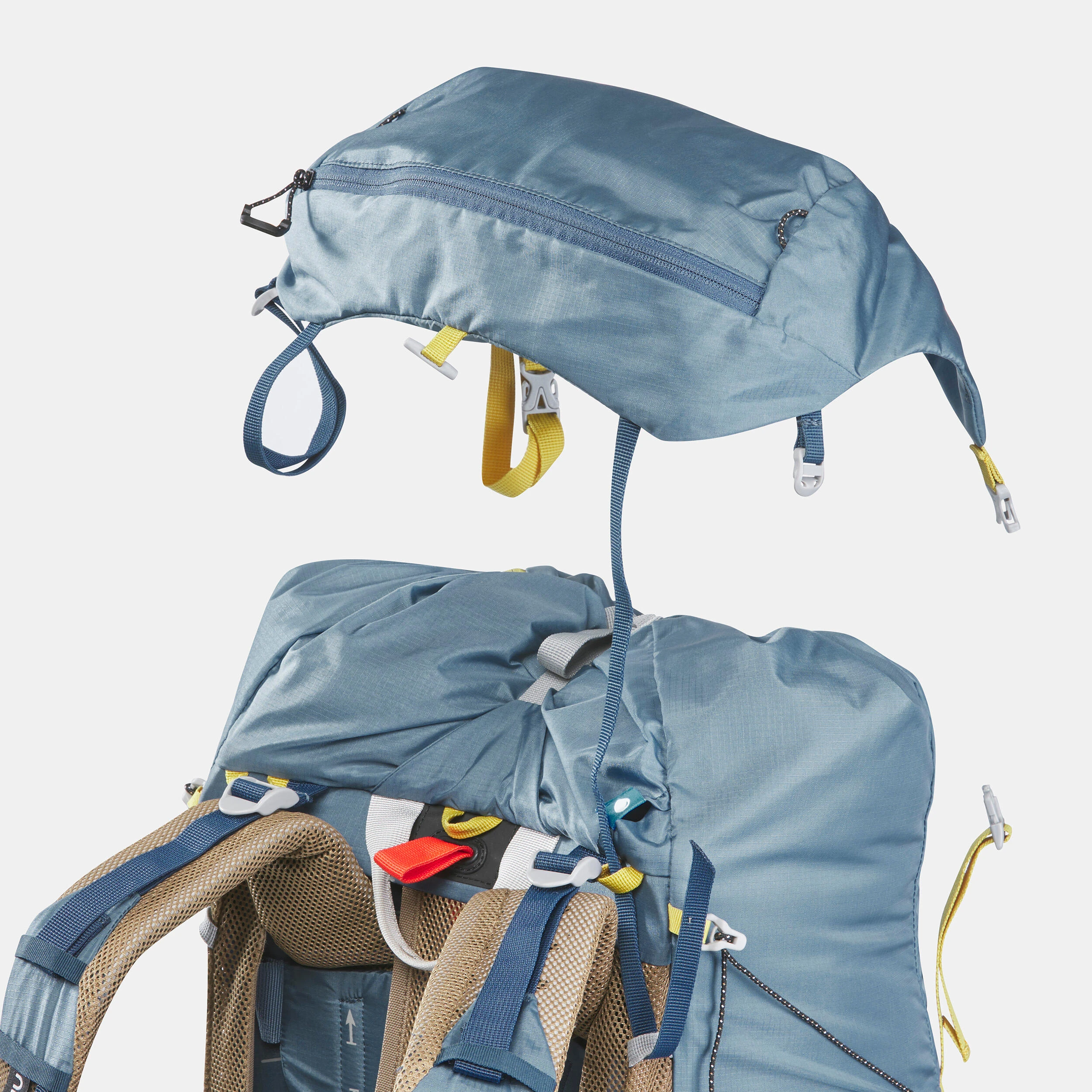 The new MT500 AIR and MT900 UL series of trekking backpacks have two straps with open aluminium buckles (on the lower part of the bag). These straps let you hook on a tent or mattress under the bag or on the barrel. If not in use, these straps can be stored (by pushing them inside) in the hidden pocket intended for this or detached and used elsewhere with the lark’s head knot buckle.